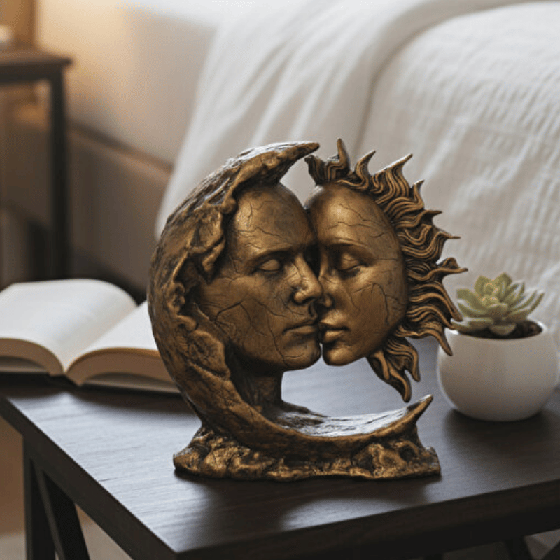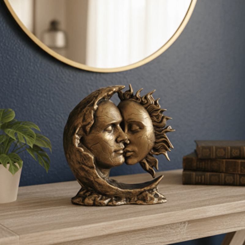 DEKOROMİ koleksiyonunun en romantik parçalarından biri olan bu Dekoratif Ay Güneş Erkek ve Kadın Biblo, evrensel uyumu ve aşkı temsil eder. 28x28 cm boyutlarındaki bu etkileyici obje, tamamen 3D kabartma tekniği ile el boyaması olarak hazırlanmıştır. Ay ve güneşin zıtlık içindeki bütünlüğünü yansıtan bu tasarım, yaşam alanınıza derinlikli ve anlamlı bir estetik katar.
