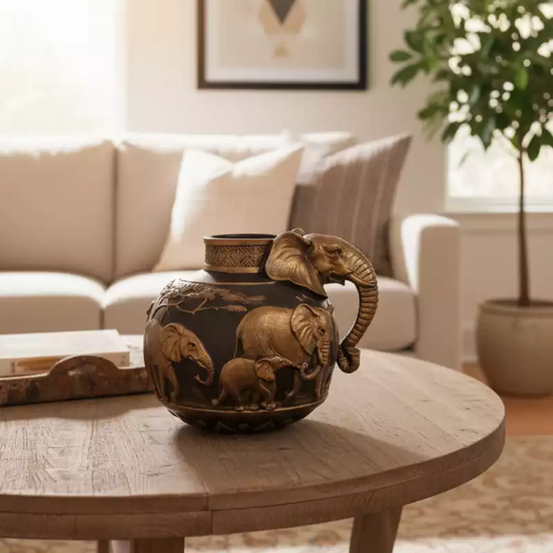 Dekoromi’nin zarafetle tasarladığı Dekoratif Fil Figürlü Lüks Vazo Heykel (25x32x27cm), klasik ve modern çizgileri birleştiren etkileyici bir 3D objedir. El boyaması detaylarla süslenen bu özel parça, fil figürünün sembolize ettiği güç ve bereket temasını yaşam alanlarına taşır. Hem vazo hem de dekoratif obje olarak kullanılabilir; salon, antre veya ofislerde sofistike bir atmosfer yaratır. Parlak yüzey dokusu ve üç boyutlu formu, mekâna derinlik katar. Kaliteli malzeme yapısı uzun ömürlü kullanım sunar. Estetik tasarımıyla ev dekorasyonu, raf dekorasyonu ve obje koleksiyonları için mükemmel bir tercihtir. Sevdiklerinize anlamlı bir sevgililer günü hediyesi, zarif bir doğum günü hediyesi veya özel bir yeni ev hediyesi olarak sunulabilir. Hediyelik ev dekorasyon ürünleri arasında asil duruşuyla fark yaratır.