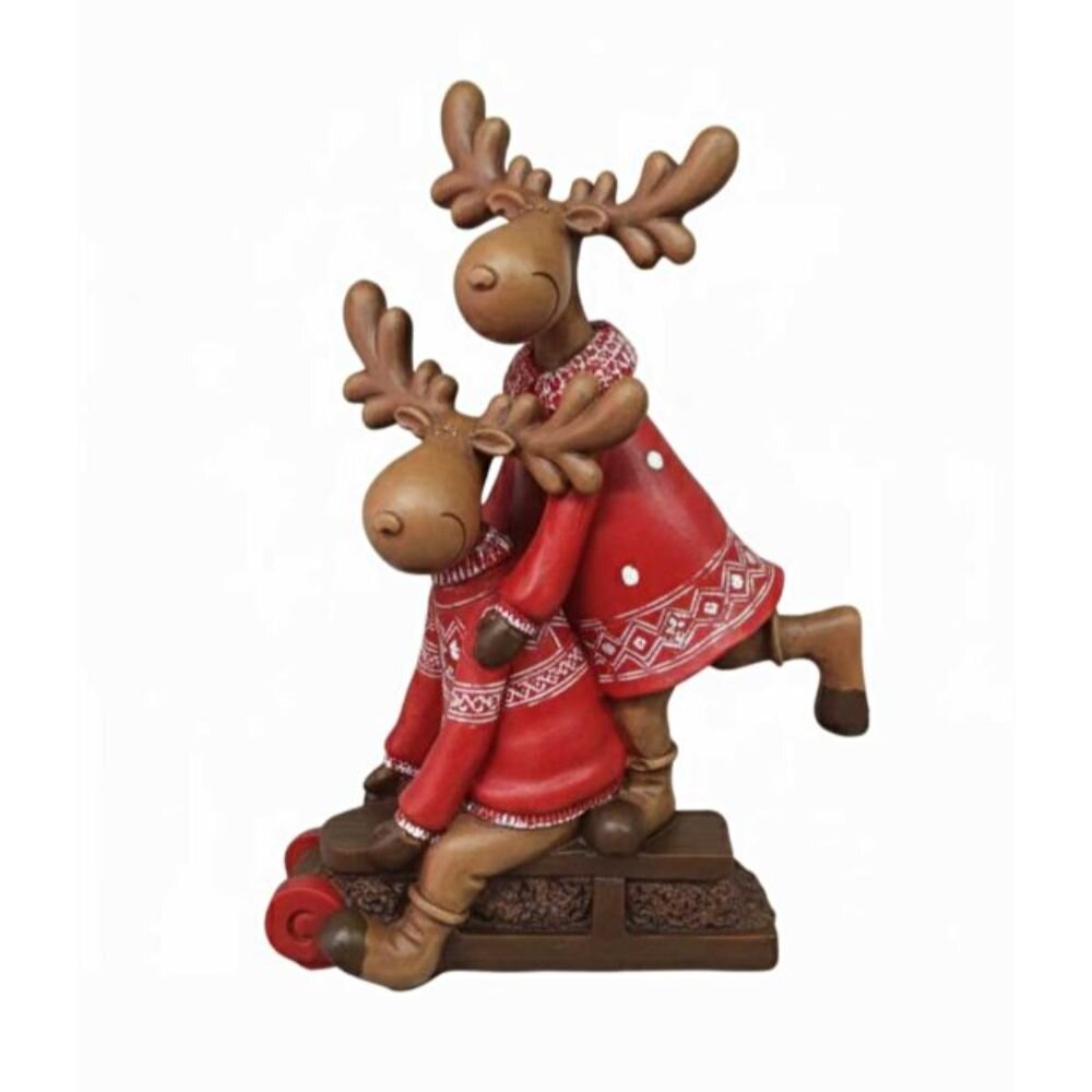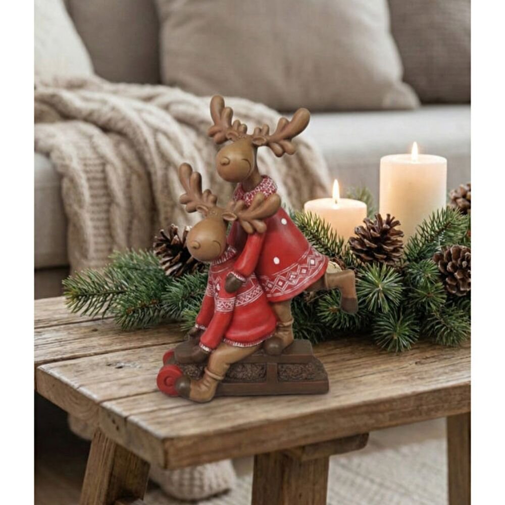 Kızak üzerinde tasarlanan bu geyik çifti, bağlılığı ve huzuru simgeler. 2025-2026 kış heykel ve aksesuar trendlerine uygun olarak hazırlanan bu parça; şömine üstlerinde, yemek masası düzenlemelerinde veya kış bahçelerinde odak noktası oluşturur. Dekoromi kalitesiyle sunulan bu tasarım, kompakt yapısı sayesinde kitaplık raflarında veya çalışma masalarında yer kaplamadan büyük bir estetik etki yaratır.