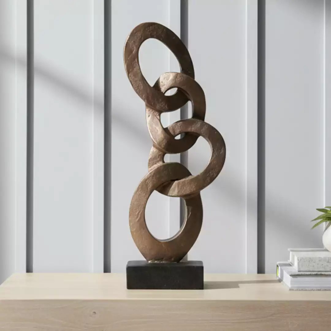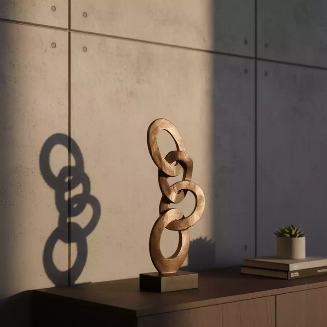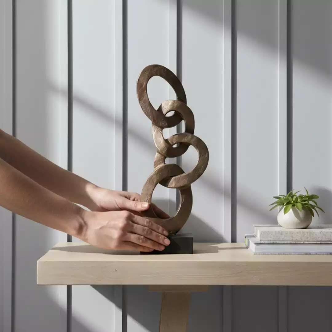 Yaşam alanlarınızı sanatsal bir dokunuşla zenginleştirmek için tasarlanmış Dekoratif Zincir Halka Obje ile tanışın. Modern iç mekan dekorasyon trendlerinin vazgeçilmezi olan bu bronz renkli biblo, hem estetik hem de anlamlı bir parçadır. İç içe geçmiş zincir halkalarından oluşan soyut ve dinamik tasarımı, mekanda anında bir odak noktası yaratır.